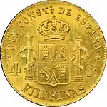 - In gold escudos: 1⁄2, 1, 2, 4, 8 escudos; each escudo worth approximately 2 silver pesos or 16 reales.