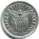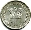 10 centavos | 17.5 mm (1903–1906) 16.5 mm (1907–1935) | 2.69 g (1903–1906) 2 g (1907–1935) | 90% Silver (1903–1906) 75% Silver (1907–1935) | Reeded | Lady Liberty striking an anvil with a hammer and Mt. Mayon | Eagle atop stars-and-stripes shield; legend "United States of America"; mint date & mintmark | yyyy | 1903 1903 S 1904 1904 S 1905 1906 1907 1907 S 1908 1908 S 1909 S 1911 S 1912 S 1913 S 1914 S 1915 S 1916 S 1917 S 1918 S 1919 S 1920 1921 1929 M 1935 M | |