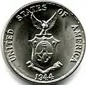 The reverse of the coins comes in two varieties. The earliest coins were minted when the islands were a US Territory, and they bear the arms of the US Territories. This is a broad winged eagle, sitting atop a shield divided into two registers. The upper register has 13 stars, and the lower register has 13 vertical stripes. The date appears at the bottom, and "United States of America" appears at the top.