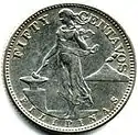 10 centavos | 16.5 mm | 2 g | 75% Silver 25% Copper | Reeded | The standing figure of an adolescent female was utilized. She is clad in a long, flowing gown and holds in her right hand a hammer, resting atop an anvil, as seen on the minor coins. Behind her is again Mt. Mayon, an almost perfectly conical volcanic mountain southeast of the capital city of Manila. The statement of value appears above her (Ten, Twenty, and/or Fifty Centavos) in English, while the name of the archipelago is written below in Spanish as FILIPINAS.[15][lower-alpha 3] | 3,500,000 3,750,000 2,500,000 31,592,000 137,208,000 |