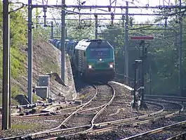 Start of the line seen from Collonges - Fort l'Ecluse. The daily waste disposal train is approaching from the Chevry terminus.