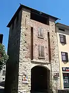 • Porta Rocca, the fortification to the north towards Bergamo and seat of the municipality of Cologno al Serio.[4] The name derives from a fort erected at the end of the thirteenth century along the outer perimeter, of which it is an integral part. Only the lower part of the tower has maintained its original character, while the upper part has been rebuilt over the years. These architectural changes are due to the continuous and repeated damage caused by numerous war events that have marked the history of Cologno. This door also has a coat of arms depicting the Moioli family, who in the seventeenth century owned the castle donated to him by the community of Cologno al Serio in recognition of their contribution to the defence of the town [12]
