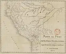 Around the same time, a newly independent Republic of Colombia established three provinces in October 1821: the northern, central, and southern provinces. The latter nominally included the Jaén de Bracamoros Province.[11] The province, however, had declared itself part of the Presidency of Trujillo on June 4, alongside Tumbes on January 7 and Maynas on August 19.[12][13] With the entry of San Martín's troops into Lima on June 9, the Peruvian proclamation of independence took place on July 28 of the same year, and Trujillo, Tumbes, Jaén and Maynas being integrated into the new state.[14][15]