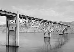 The Columbia River Bridge, also known as the Bridgeport Bridge, at Bridgeport, Washington, was built to span the Columbia River in 1950. Composed of three spans, the bridge is a steel continuous riveted deck truss carrying Washington State Route 17 on a 26-foot-wide (7.9 m) roadway and two 3-foot (0.91 m) sidewalks. The center portion of the bridge spans 300 feet (91 m), flanked by 250-foot (76 m) end spans. The 70-foot (21 m) north approach span and the 100-foot (30 m) south approach span are supported by steel plate girders. The bridge played a significant role in the construction of the Chief Joseph Dam just upstream, as no bridge crossing had previously existed in the area. Construction on the dam started in 1945 and was completed, apart from the powerplant, in 1955. The bridge was designed and built by the U.S. Army Corps of Engineers as part of the Chief Joseph Dam project, and is significant for its association with the project and as a major crossing of the Columbia.[2]