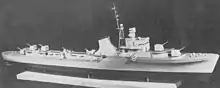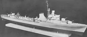 The ships would have been equipped with six 533-millimeter (21 in) torpedo tubes for SI 270 torpedoes in two triple mounts amidships.[3] Possessing a 270-kilogram (595 lb) warhead, the torpedo had ranges of 4,000 meters (4,374 yd) at 46 knots (85 km/h; 53 mph) and 12,000 meters (13,123 yd) at 29 knots (54 km/h; 33 mph).[9] The Italians intended to provide them with a sonar system of an unknown type for anti-submarine work. They would have been fitted with a pair of depth charge throwers and 64 depth charges.[3] The Comandanti Medaglie d'Oros would have been able carry 52 mines as well.[10]