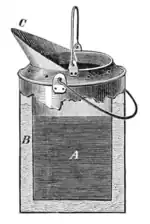 A kettle used for making composition. "A" indicates the liquid composition mixture, "B" the outer area filled with water forming a heated bath.