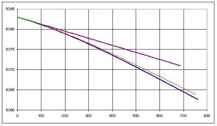 Note the way the solution bvp bends over the straight line. A consequence of this property is that the ray can reach locations situated below the horizon of S. This is consistent with observations.[8] The trajectory is a Concave function is a consequence of the fact that the gradient of the refraction index is negative, so the Eikonal equation implies that the second derivative of the trajectory is negative. From the point where the ray is parallel to ground, relative to the chosen coordinates, the ray goes down but relative to ground level, the ray goes up.