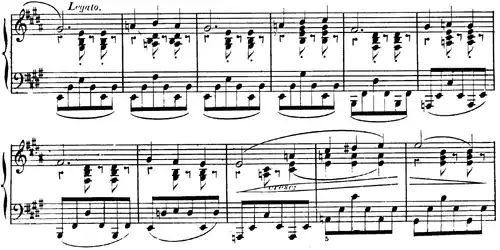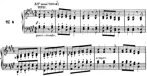 The opening bars, constituting the first theme, are marked "quasi-trombe" (like trumpets). Such markings appear frequently throughout the score to indicate the orchestral instrument the pianist is supposed to evoke. After this theme is exposed, the contrasting, more lyrical second theme begins. This second theme is used as a contrast to both the first theme itself and, more generally, any difficult virtuosic passages.