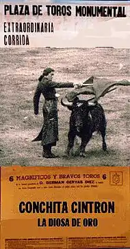 Concepción Cintrón Verrill, also known as Conchita Cintrón or La Diosa de Oro ('The Golden Goddess') [1] (August 9, 1922, in Antofagasta February 17, 2009, in Lisbon), was a Chile-born Peruvian torera (female bullfighter), perhaps the most famous in the history of bullfighting. In the ring Cintrón was said to display particular grace, style and bravado, a combination known as duende.