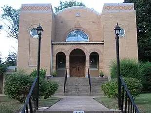 The Cumberland Presbyterian Church building, continued to serve as the congregation's place of worship until 1941, when the current temple building was completed. Construction of the new building was funded with money accumulated in a building fund that had been started in 1924. The building was designed by Memphis architect Carl Heyer and constructed by Jackson building contractor Hubert Owen. Pews from the Cumberland Presbyterian Church building were installed in the new building; these pews are still in use. Classrooms were added to the building in 1962.[2]