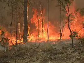 Fire has been identified as having impacts on species within the park, studies of the eastern bristlebird indicates it responds well to planned mosaic burning which allows the bird to move into areas of unburnt habitat after fire. Feral animal baiting after fire is also needed as reduced vegetation cover leaves the birds more susceptible to predation from feral cats and foxes.[55] Species like the black-breasted button-quail and glossy black-cockatoos are also fire sensitive, the Eucalyptus montivaga community is reliant on fire for maintenance of a healthy understorey.[1][29][56] A fire management strategy has been prepared for Conondale National Park with the Eucalyptus montivaga vegetation community currently being studied for its response to fire.[1]