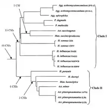 The members of the order Pasteurellales are currently distinguished mainly based on their position in the branching of the 16srRNA tree. There are currently very few molecular markers known that can distinguish members of this order from other bacteria. A CSI approach was recently used to elucidate the phylogenetic relationships between the species in this order; more than 40 CSIs were discovered that were uniquely shared by all or most of the species. Two major clades are formed within this Pasteurellales: Clade I, encompassing Aggregatibacter, Pasteurella, Actinobacillus succinogenes, Mannheimia succiniciproducens, Haemophilus influenzae and Haemophilus somnus, was supported by 13 CSIs. Clade II, encompassing Actinobacillus pleuropneumoniae, Actinobacillus minor, Haemophilus ducreyi, Mannheimia haemolytica and Haemophilus parasuis, was supported by 9 CSIs. Based on these results, it was proposed that Pasteurellales be divided from its current one family into two different ones. Additionally, the signatures described would provide novel means of identifying undiscovered Pasteurellales species.[18]