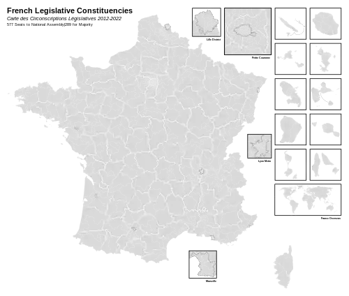 In 2010, a new set of constituency boundaries was adopted, with the dual purpose of ensuring a more equal number of voters per constituency, and of providing seats in the National Assembly to representatives of French citizens resident outside France. 33 constituencies were abolished, and 33 new ones created. Of the latter, 17 are in metropolitan France, five are in overseas France, while the rest of the world was divided into 11 constituencies for French residents overseas. These new constituencies were contested for the first time in the National Assembly elections of June 2012.[1][2]