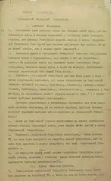 - ↑ Laws of Ukraine. Ukrainian Central Rada decree No. n0002300-18: Constitution of the Ukrainian National Republic (Statute on the state government, rights and freedoms of the UPR). Adopted on 1918-01-09. (Ukrainian)