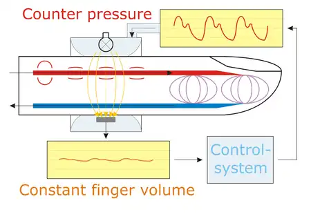 For the realization, a cuff is placed over the finger. Inside the cuff, the blood volume in the finger arteries is measured using a light source and a light detector. The resulting light signal is kept constant by controlling the alterable cuff pressure. During systole, when blood volume increases in the finger, the control system increases cuff pressure, too, until the excess blood volume is squeezed out. On the other hand, during diastole, the blood volume in the finger is decreased; as a result, cuff pressure is lowered and again the overall blood volume remains constant. As blood volume and, thus, the light signal is held constant over time, intra-arterial pressure is equal to the cuff pressure. This pressure can easily be measured with a manometer.