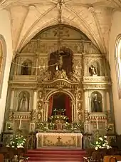 The nave consists of five sections, covered by wood ceiling, separated into galleries by solid silhouetted faces, torned by high arches pointed out from two archivolts, hanging over rectangular pillars, embedded and flanked by thin columns, all topped with phytomorphic crochet capitals.[2] Between the arches, are ogival gaps. In one of the lateral naves there is a chapel wall with the Tree of Jesse.[1][2] On the lateral face of the southern gallery, is the portico of the Chapel of Dom Fradique and, opposite it (on the epistle side), the tomb of Esteves da Gata.[2] The cross is open to four bands, similar to the nave and chancel, consisting of vaulted ceilings in masonry and triumphal arch dividing the retable.[2] The remaining arm of the transept, as well as the apse, covered in two-ribbed ogival sections, with buttons in black marble, that allow light to filter through slits.[2]