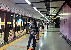 Convention & Exhibition Center station (simplified Chinese: 会展中心站; traditional Chinese: 會展中心站; pinyin: Huì-Zhǎn Zhōngxīn Zhàn; Jyutping: Wui6 Zin2 Zung1 Sam1 Zaam6); formerly Huizhanzhongxin station is an interchange station on Line 1 and Line 4 of the Shenzhen Metro. It opened on 28 December 2004. It is located under the junction of Fuhua Lu (福华路; 福華路) and Zhongxin Erlu (中心二路) in Futian District, Shenzhen, China. It gives access to Central Walk shopping mall (怡景中心城), Link City, Wongtee Plaza, the Sheraton Hotel,[2] the Shangri-La Hotel, and Shenzhen Convention and Exhibition Center.[3][4]