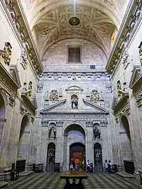 The portico, composed of semicircular arches, is inspired by Italian Renaissance loggias, contrasting its sparse ornamentation with the decorative exuberance of the church façade. It was made by Juan Ribero de Rada between 1590 and 1592, but the medallions of the spandrels are the work of sculptor Martín Rodríguez.