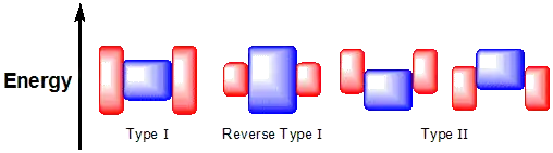 In the type II configuration, the valence and conduction band edge of the core are both lower or higher than the band edges of the shell. An example of a type II is shown in figure X, ZnTe (bandgap:2.26) /CdSe (bandgap:1.74). The lowest energy separation of the electron and the hole will occur when the hole is confined in the ZnTe core valence band and the electron is confined in the CdSe shell conduction band. The emission wavelength will be determined by the energy difference between these occupied states, as shown by the red arrow, which will be at a lower energy than either of the individual bandgaps.[15] The emission wavelength can be significantly red shifted compared to the unpassivated core.