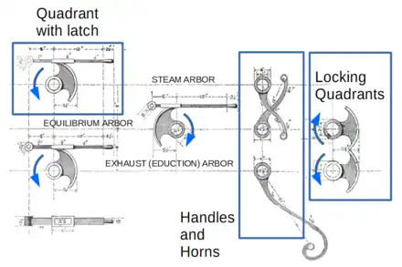 Even when operating the engine manually there are limits on how the engine can be configured. It is never appropriate to have both the exhaust and equilibrium valves open at the same time. To avoid this an additional pair of quadrants are used as “locking quadrants”. These are oriented so that in the closed position they lie almost touching, allowing either of them to move to the open position.[3]:165 However once one is open it blocks the other from opening. Note that Pole[5]:129 describes a more complex system of tappets and levers to achieve the same mutual locking effect between the exhaust and equilibrium valves.