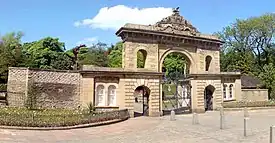 The first steps toward the establishment of the park were taken in 1845 when a sum of £4701 19s 7d was raised towards the purchase and implementation of the park by the sale of land on the town's moor.[9] The 50 acres (200,000 m2) for the park were secured in January 1855 with the purchase by the then Mayor, Thomas Dugdale, for the Corporation, from Joseph Feilden for £3,237 6s 3d. at £65 per acre.[10] Blackburn Corporation was also required to build public roads on the east and west sides of the estate (now East and West Park Roads) at an eventual cost of £4,480 17s 1d.[10] In 1855 work commenced on the Preston New Road entrance by Roberts and Walmsley, awarded the contract to build the arch and lodge at a cost of £789.[9] The East and West lodges were constructed at this time. In 1857 Three of the four fountains in the park built and paid for by Mayor William Pilkington, including the largest at the main entrance built by Varley's of Blackburn. The fourth fountain, which stands in the stream running down from the main lake, was built later than the others and was paid for by John Dean. It is made of slate and is of a simpler design than the others.[7] In 1857 two Russian cannons captured from Sevastopol during the Crimean War presented to the town as a Trophy by Lord Panmure, the Secretary of War.[9] These were mounted on a stone-faced battery at the top of the park. By its opening the total cost of the park was £14,701 19s 1d.[10]