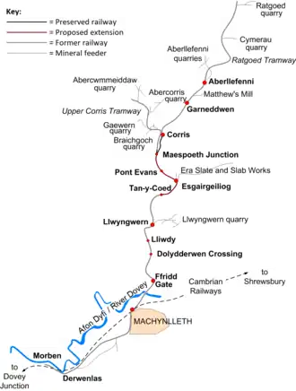 Before 1859, slate from the quarries at Corris, Corris Uchaf and Aberllefenni was hauled by horse-drawn carts and sledges to wharves on the banks of the River Dyfi. The first proposal to construct a railway connecting the quarries to the coast came in August 1850, when the owners of the Aberllefenni, Abercorris, Gaewern and Hengae quarries met with engineer Arthur Causton to propose the Abercorris and Aberdovery Railway.[1] By November 1850, the name had changed to the Corris, Machynlleth & River Dovey Railway or Tramroad which was planned to run down the Dulas Valley and then along the north shore of the Dyfi past Pennal to Pant Eidal, near the later main-line Gogarth Halt.[2] A bill was submitted in early 1851, withdrawn, then resubmitted in December. The bill specified the tramroad's gauge as 2 ft 2+12 in (673 mm); due to the narrow gauge selected, the House of Lords committee imposed a restriction in the bill that forbade the use of locomotives.[3]