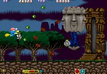 Players must blast various monsters and avoid being shot while collecting crystal power-ups to enhance Cotton's firepower and unleash powerful magic spells on enemies, in addition of bombs capable of obliterating enemies.[3][4][5] The game incorporates some role playing game elements, as players are able to level up their attack up to 13 levels.[5][6] The player has lives represented by an arrow and three lives, though only one hit is allowed per life and the game is over once all lives are lost, unless more credits are inserted into the arcade machine to continue playing.