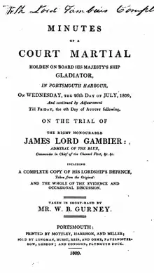 The Court-martial of James, Lord Gambier, was a notorious British naval legal case during the summer of 1809, in which Admiral Lord Gambier requested a court-martial to examine his behaviour during the Battle of Basque Roads in April of the same year. Noted for the acrimony and corruption of proceedings, it has been described as "one of the ugliest episodes in the internal history of the Royal Navy".[1]