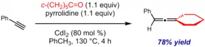 The Crabbé reaction (or Crabbé allene synthesis, Crabbé–Ma allene synthesis) is an organic reaction that converts a terminal alkyne and aldehyde (or, sometimes, a ketone) into an allene in the presence of a soft Lewis acid catalyst (or stoichiometric promoter) and secondary amine.[1][2] Given continued developments in scope and generality, it is a convenient and increasingly important method for the preparation of allenes, a class of compounds often viewed as exotic and synthetically challenging to access.