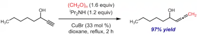 The transformation was discovered in 1979 by Pierre Crabbé and coworkers at the Université Scientifique et Médicale (currently merged into Université Grenoble Alpes) in Grenoble, France.[3] As initially discovered, the reaction was a one-carbon homologation reaction (the Crabbé homologation) of a terminal alkyne into a terminal allene using formaldehyde as the carbon source, with diisopropylamine as base and copper(I) bromide as catalyst.[4]