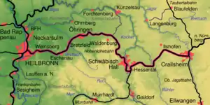 The Crailsheim–Heilbronn railway (also called the Hohenlohebahn—"Hohenlohe Railway"—and called the Kocher Railway in the time of the Royal Württemberg State Railways) is a double-tracked, main line railway in southwest Germany that runs from Heilbronn, crossing the Hohenlohe region.