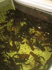 An invasive species, the Marbled crayfish are eaten in Madagascar.[3] This species is parthenogenic where the eggs hatch without fertilisation, meaning that they are all clones of each other. Human interest in consuming them may be helping them to spread[3] 100-fold from 2007 to 2017.[4]