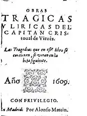 - 1 2 3 4 One or more of the preceding sentences incorporates text from a publication now in the public domain: Chisholm, Hugh, ed. (1911). "Virués, Christóbal de". Encyclopædia Britannica. Vol. 28 (11th ed.). Cambridge University Press. p. 217.