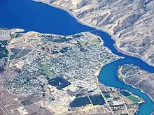 Cromwell is between State Highway 6 (linking to Wānaka, 50 kilometres (31 mi) north, and Queenstown via the Kawarau Gorge, 60 kilometres (37 mi) west) and State Highway 8 leading to the Lindis Pass, 75 kilometres (47 mi) northeast, and Alexandra, 33 km south. The road to Alexandra winds through the Cromwell Gorge. A point near Cromwell lies 119 kilometres from the sea, the farthest from the sea anywhere in New Zealand.[4] A prominent feature surrounding much of the town is the man-made Lake Dunstan.
