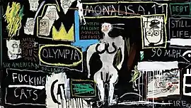 Basquiat contrasts a black background with a centered frontal figure of a nude white woman surrounded by colorful texts and cartoon heads. The female figure may be a nod to Édouard Manet's Olympia. To the left of the figure, Basquiat directly references Manet's Olympia, a reoccurring subject tackled by Basquiat in his works during that period such as Three quarters of Olympia minus the Servant (1982) and Untitled (Detail of Maid from Olympia) (1982). Author Leonard Emmerling noted that "if a black woman is a rarity in European painting, it is all the more indicative of an underlying racism when one does appear, as Manet's work, merely as the servant of a naked, white-skinned beauty."[8]