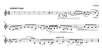 "Csárdás" (or "Czardas") is a rhapsodical concert piece by the Italian composer Vittorio Monti. Written in 1904, the folkloric piece is based on a Hungarian csárdás.[1] It was originally composed for violin, mandolin, or piano.[2] There are arrangements for orchestra and for a number of solo instruments. "Csárdás" is about four-and-a-half minutes in duration.[2]