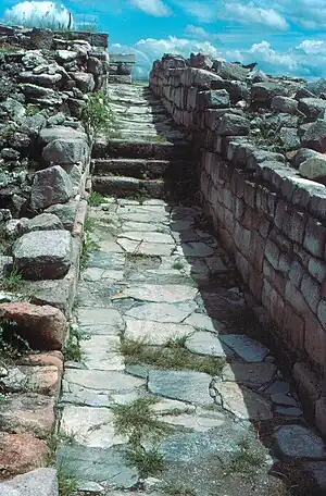 This stage is characterized by limestone rock walls that make up leveling platforms as well as housing foundation, with figurines and some pots found. These materials show that the site was then a small village - perhaps dependent on a larger Olmec-related culture (Mezcala) settlement in the Balsas River region during the mid-preclassical era (800-1000 BCE), or, as it seems more likely, that it was inhabited by people who settled here around 600 BCE, at the decline of the Olmec sites.[2]