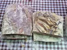 Pigs are part of the mixed farming economy. Traditionally every farm kept a Welsh pig as part of the staple diet.[8] During the winter, the main source of meat was cured ham and bacon from pigs raised on the farm.[2] Hams were cured in the large chimneys of farm kitchens, which slowly dried the ham and bacon after it had been salted.[2] This tradition has largely died out, but the remaining producers make hams which are similar to Bayonne, Serrano, or Parma hams.[10] Freshly cured ham is sliced for grilling, older ham is boiled as a York ham, and ham cured for many months is sliced wafer thin, like Parma ham. Carmarthen ham has a similar farmyard flavour. The hocks have the greatest flavour, and need to be boiled a long time to soften the meat. They make a good base for winter stew, or a summer ‘paysanne’ salad.[2] Dry-cured Carmarthen Ham can be found at Carmarthen Market. Six generations of the Rees family have sold ham here [11] spanning 200 years.[12] and their family were the first commercial producers of dry-cured ham in Britain.[8] Carmarthen Ham is dry salt-cured and then air dried and sold whole boneless, or sliced thinly and vacuum packed.[11] It is believed that when the Romans settled in Carmarthen they acquired the recipe and on their return to Italy called it Parma Ham.[11] The ham is cut in thin wafers and is served like prosciutto or Parma ham, but is saltier.[3] Carmarthen Ham production remains a cottage industry, in order to keep it a premium product.[11] Carmarthen Ham is a particular favourite of the Prince of Wales.[12] The Rees family also produce a short back and streaky bacon. This is dry-cured for one week and hung for a further three weeks. It is recommended that the bacon is blanched before frying to remove any excess salt.[2] The Rees family have more than 80 hams curing at any one time,[13] and it takes nine months to cure [13] they also have a mail order business and travel to the nearby markets of Brecon, Fishguard, Haverfordwest, Pembroke and Cardigan.[3]