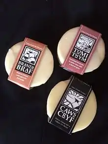 Other Carmarthenshire cheeses include Caws Cenarth and Kid Me Not, both winners of prizes at the British Cheese Awards.[5] Caws Cenarth supplies Perl Las blue organic cheese to England's Twickenham rugby stadium and has also supplied British Airways.[5]