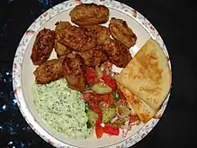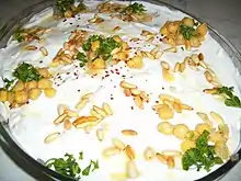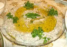 Cheese, as well as yogurt and eggs, are used in the cuisine of Lebanon. One of the more recognizable dishes within Lebanon is labneh. Unlike regular yogurt, labneh is strained so as to remove the watery whey, leaving a thicker, creamier consistency. It is spreadable and garnished with olive oil and sea salt.[44] It is an extremely versatile dish that can be served in a mezze platter for either breakfast or dinner. A variant is mixed with garlic.[44] Ejjeh is the traditional omelette of Lebanon.[45] It is made with egg, chopped parsley and scallions. Within Lebanon, people make this omelette with different herbs that are cultivated from their village.[46][47]