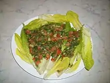 Vegetarian cuisine plays an important role in the cuisine of Lebanon. Being located in the Levant, vegetables and herbs (wild or cultivated) are abundant in the fertile landscape and serve as a main base of the cuisine.[69] For Lebanese Christians, including Catholic (Maronites and Melkites) and Orthodox, fasting from meat is practiced over the Lenten period (from midnight to noon) during Easter. Where abstention of meat is observed, the food is referred to as akl aateh (meaning food "cut" from the diet, such as meat or absent from meat). The particular food that is "cut" varies over different traditions.[70]