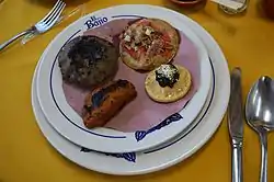 The mountains areas have more corn-based dishes. Xalapa is known for its street foods of this type, such as picaditas and a related dish called garnadchas. Both are thick, bean-stuffed corn cakes.[2] One notable dish of the mountain areas is zacahuil, which is generally described as a giant tamale often several feet long, able to feed between fifty and 150 people.[3][10] Like tamales in Mexico, it consists of corn, flavorings and meat, which are wrapped then cooked. For sacahuil, the wrapping is either leaves from a plant called papatla or those from the banana tree, laid out. Roughly ground corn meal mixed with lard and chili peppers, seasonings and salt is spooned over the leaf wrapping. Pieces of meat, usually pork, are laid on top of this. The leaves are folded over the filling and tied in place then the zacahuil is placed in an oven to cook for ten to twelve hours. However, unlike most tamales, the consistency of the filling after cooking is not solid, but rather stew like. The dish is generally served for weddings, religious festivals and other special events. Prepared portions are often sold in traditional markets, restaurants and by street vendors.[10]
