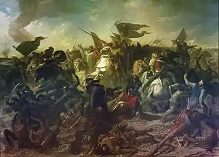 - Franz Sales Lochbihler (1777–1854) painted Die Schlacht auf dem Lechfeld, depicting the battle of Lechfeld. Otto, wearing a winged helmet and riding a white horse, was trampling upon a bare-chested Hungarian. Harald Jakobs opines that the painting shows Otto's spirit controlling the wildness of the Magyars, represented by mad-looking horses.[69][70][71]