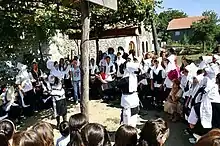 The death ceremony also had its own traditional features in the area. When someone dies, everyone gathers to the deceased house. First the closest relatives are notified and they decide who should be sent the news and they determine the time of funeral. The corpse is prepared by the closest of kin, and if it is a man that is done by men, and if a woman by the women. If the deceased died late in the day and his burial cannot take place on the same day, then he will be guarded by his relatives and family members of the same genre as he. The corpse is taken among the women and on the burial day the lamenting ladies, and in their absence sister, mother or some female close relative lament the dead by pointing out his virtue, good deeds, and the great pain felt by his loss. It is important to point out that until recently women did not take part on the burial ceremony, but they visited the deceased grave next day. After death in the men's guestroom are received those who came to express condolences and perform the burial. Condolences were accepted by those close to the family of the deceased(son, father, brother), uncle and some of his cousins. After the burial day 'seeing'(the wake) continued for some period, which has lately been reduced, lasting up to three months. Friends and well-wishers that came for condolences left an amount of money on the tray as help for the family. After the wake ceremony has been concluded and after the guests have been served coffee and cigarettes the host give them the word to speak their speeches. Those coming to express condolences usually have good words to say about the deceased, then they praise his family asking it to face up the pain.[3]