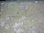 The sandstone parapet of the old bridge overlooking the site of Cunninghamhead railway station has many naive graffiti carvings on it, made over the years by local children / pupils from the local village school as they watched the old steam and diesel trains going by on the railway below.