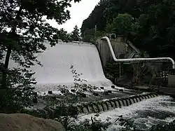 The FirstEnergy Dam was built by the Northern Ohio Traction and Light Co. in 1912 to serve the dual functions of generating hydropower for its local streetcar system and providing cooling-water storage for a coal-burning power plant; however, the hydropower operation was discontinued in 1958, and the coal-burning plant was decommissioned in 1991.[39] Some environmental groups and recreational groups want the dam removed.[40] Others contend that such an effort would be expensive and complicated, for at least two reasons: first, the formerly hollow dam was filled in with concrete in the early 1990s, and second, because of the industrial history of Cuyahoga Falls, the sediment upstream of the dam is expected to contain hazardous chemicals, possibly including heavy metals and PCBs. The Ohio EPA estimated removal of the dam would cost $5–10 million, and removal of the contaminated sediments, a further $60 million.[41] The dam is licensed through 2041.