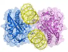 Cyclic GMP-AMP synthase (cGAS, cGAMP synthase), belonging to the nucleotidyltransferase family, is a cytosolic DNA sensor that activates a type-I interferon response. It is part of the cGAS-STING DNA sensing pathway. It binds to microbial DNA as well as self DNA that invades the cytoplasm, and catalyzes cGAMP synthesis.[1] cGAMP then functions as a second messenger that binds to and activates the endoplasmic reticulum protein STING to trigger type-I IFNs production.[2][3][4] Mice lacking cGAS are more vulnerable to lethal infection by DNA viruses and RNA viruses.[5][6] In addition, cGAS has been shown to be an innate immune sensor of retroviruses including HIV.[7][8] The human gene encoding cGAS is MB21D1 on chromosome 6.