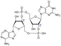 Cyclic guanosine monophosphate–adenosine monophosphate (cyclic GMP-AMP, cGAMP) is the first cyclic di-nucleotide found in metazoa.[1] In mammalian cells, cGAMP is synthesized by cyclic GMP-AMP synthase (cGAS) from ATP and GTP upon cytosolic DNA stimulation.[2] cGAMP produced by cGAS contains mixed phosphodiester linkages, with one between 2'-OH of GMP and 5'-phosphate of AMP and the other between 3'-OH of AMP and 5'-phosphate of GMP.[3][4][5][6]