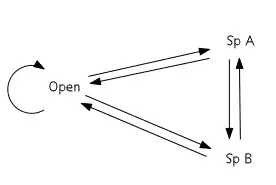 The cyclic model of succession can be displayed in terms of a transition matrix. Based on the Markov chain, the matrix describes the likelihood of future states based on the milieu of present states.[5] The three states in the simplest cyclic model are open substrate (usually a bare patch of land), Species A dominance, and Species B dominance. With respect to facilitation, inhibition, and tolerance models of succession, the key feature of the cyclic model is that A and B are not autosuccessional – that is, they do not facilitate their own growth. Rather, A will either facilitate the succession of B or be eliminated (through mortality) such that the patch occupied becomes open substrate. Likewise, B will either facilitate the succession of A or be eliminated. Open substrate can remain open or become occupied by either A or B. This configuration results in a cyclic scheme of species dominance.