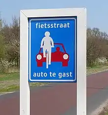A fietsstraat (cycle street)[38] is a road where bicycles are considered to be the primary and preferred form of transport and where cars and other motorised vehicles are allowed "as guests". Designs vary, but most examples incorporate red asphalt and have a speed limit of 30 km/h.[39]